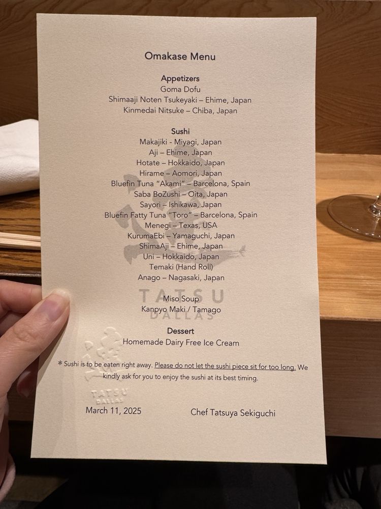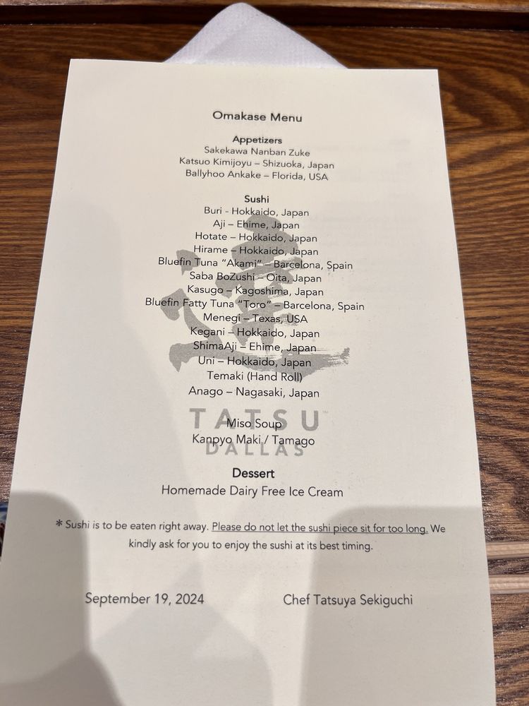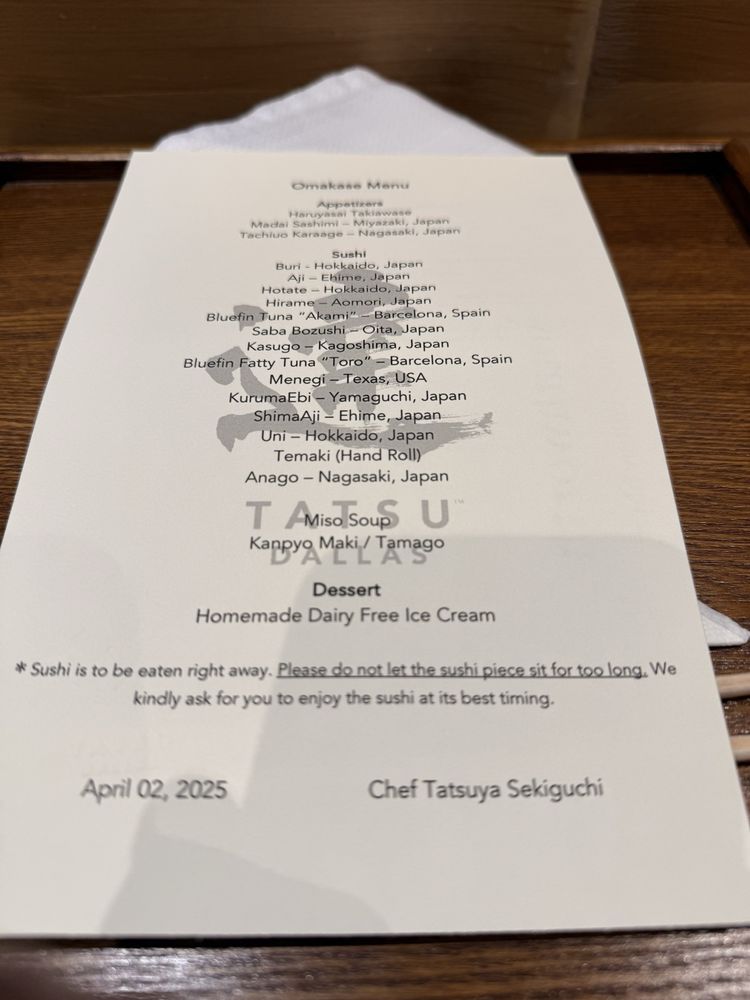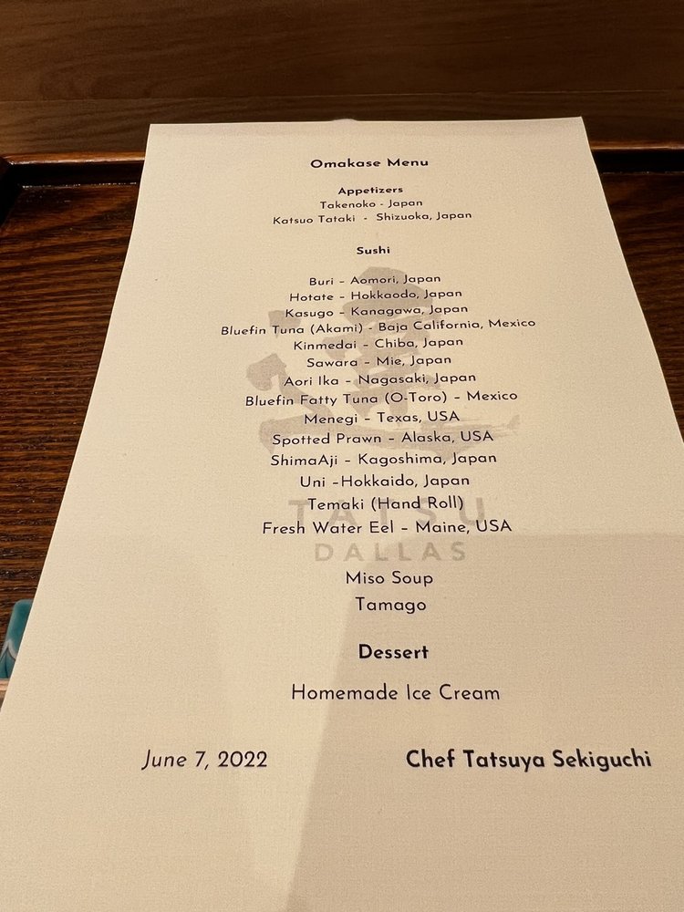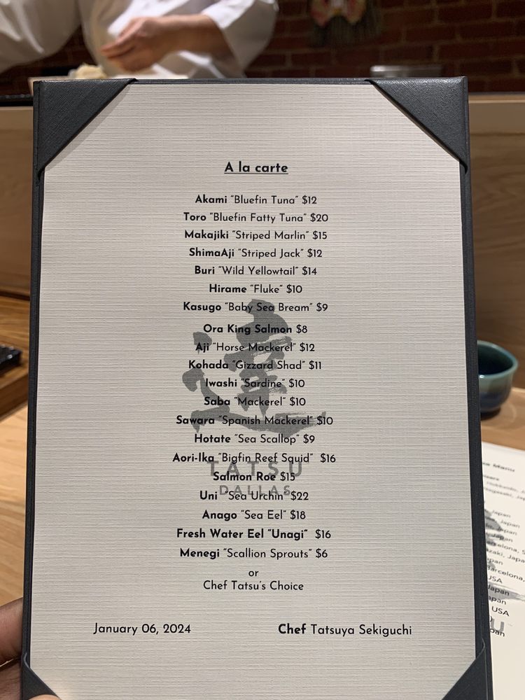 Welcome to Tatsu Dallas, where each dish embodies the artistry of omakase dining. Located in a chic spot at 3309 Elm St, this restaurant offers an immersive culinary experience unlike any other. Guests are treated to beautifully crafted courses featuring an array of seafood, such as Sawara, Hotate, and Bluefin Tuna "Akami", showcasing the chef's impeccable knife skills and selection of high-quality ingredients.
